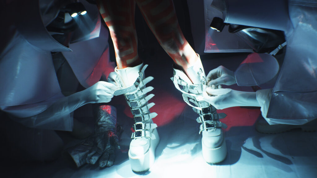 Paper Breath dépeint un monde habité par des êtres en papier. Alors quele format vidéo est bel et bien du numérique couleur, décor, accessoires,costumes sont quant à eux, noirs, blancs, et dans des nuances de gris. Cettecontrainte créative radicale permet notamment de produire davantage d’effetlorsque, à la moitié du film, une touche d’encre rouge est découverte dans lecorps d’un des personnages de papier